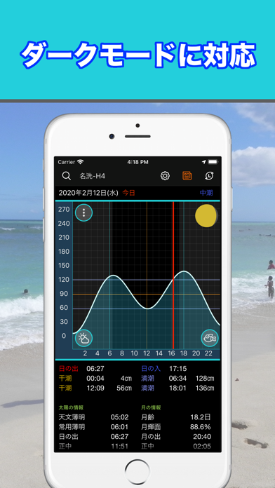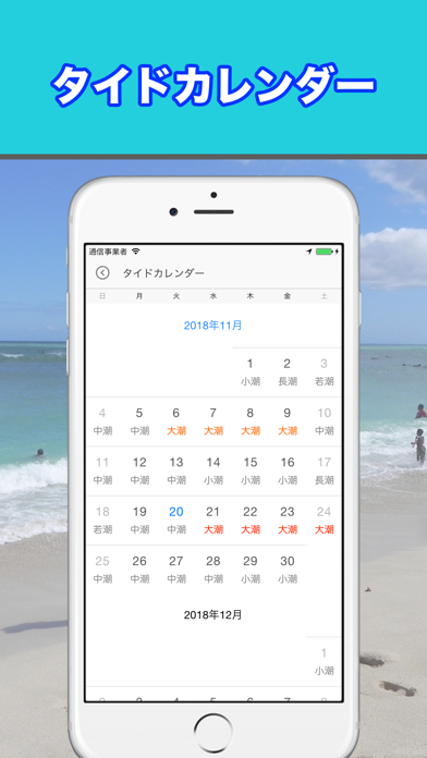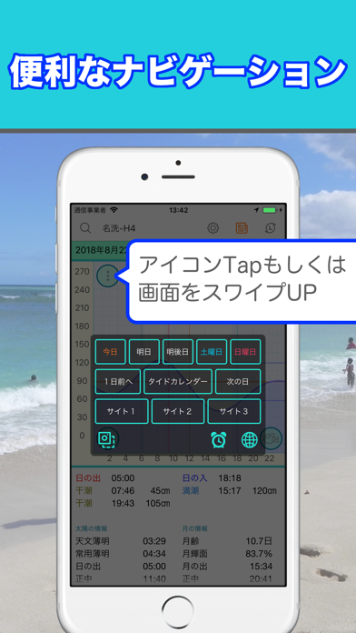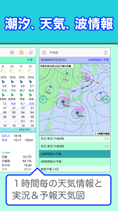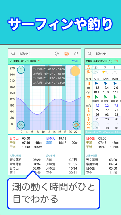 日本国内約340カ所のタイドグラフを表示。どの時間が釣れやすいかなども表示でき、釣りの予定を立てるのに役立つでしょう。日の出や日の入りもわかるので、安全なマリンレジャーを楽しめます。