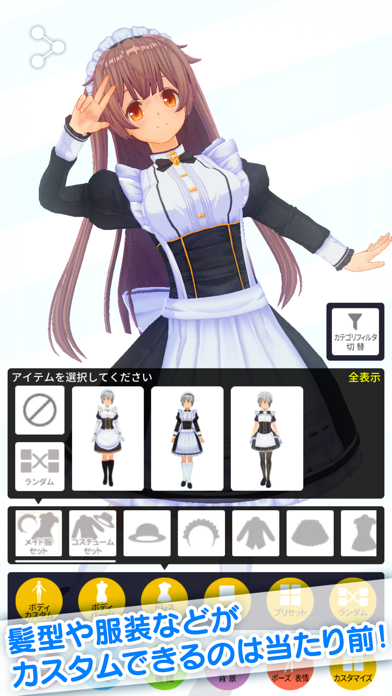 もちろん名前も設定でき、TwitterやFacebookへ、スクリーンショットを投稿できます。ポーズも多彩で、好きなのを選択してポージングをとらせることも可能。
