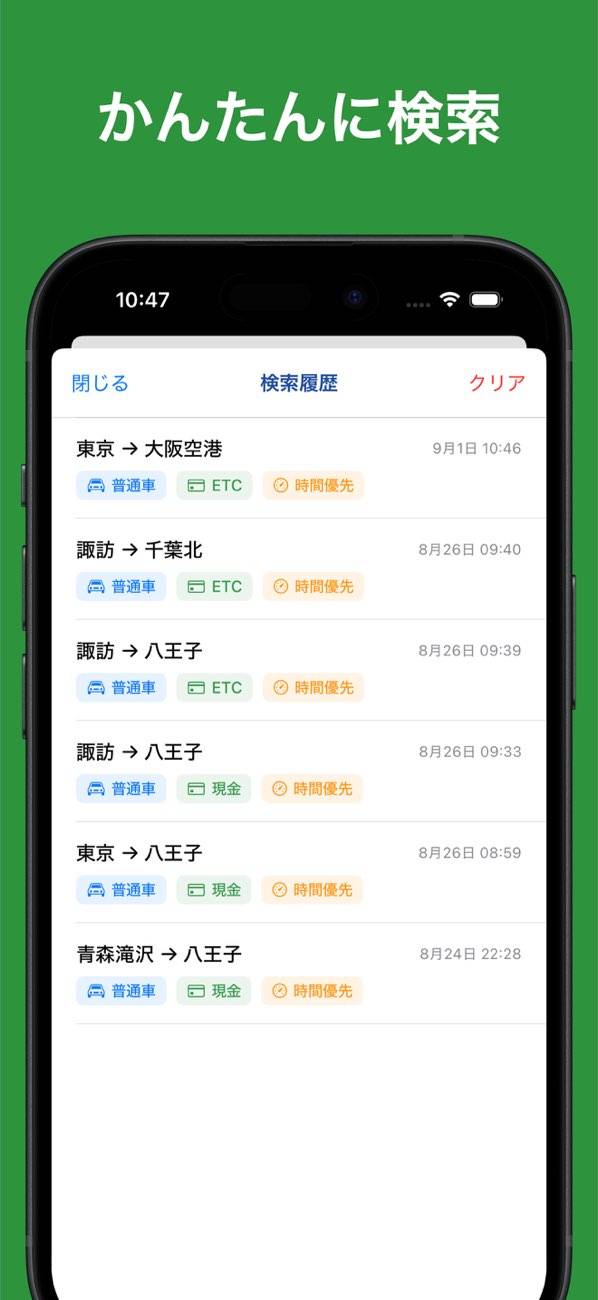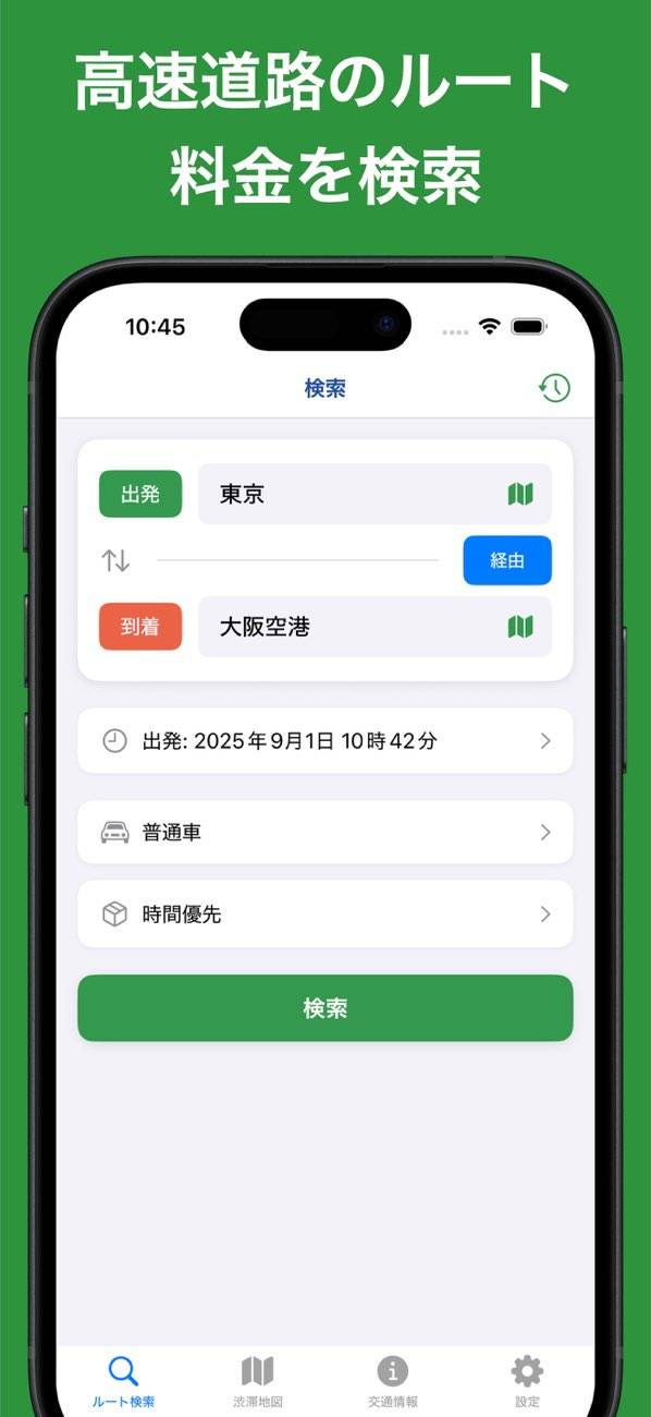 IC(インターチェンジ)名を入力すると、高速料金とルートが検索できるナビアプリ。軽・二から特大車まで車のサイズごとに調べられるようになっており、正確な料金をチェックできます。またIC名が分からなくても地名から見つけられるのが便利。事前に最適なルートをリサーチしたい人におすすめです。