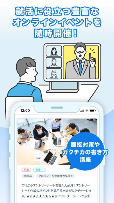 会員限定のオンラインイベントに参加できます。就活支援のプロがサポートしてくれる「面接対策講座」や、就活仲間と一緒に進める「グループディスカッション講座」を開催。就活の情報を、積極的に取り入れたい人におすすめです。
