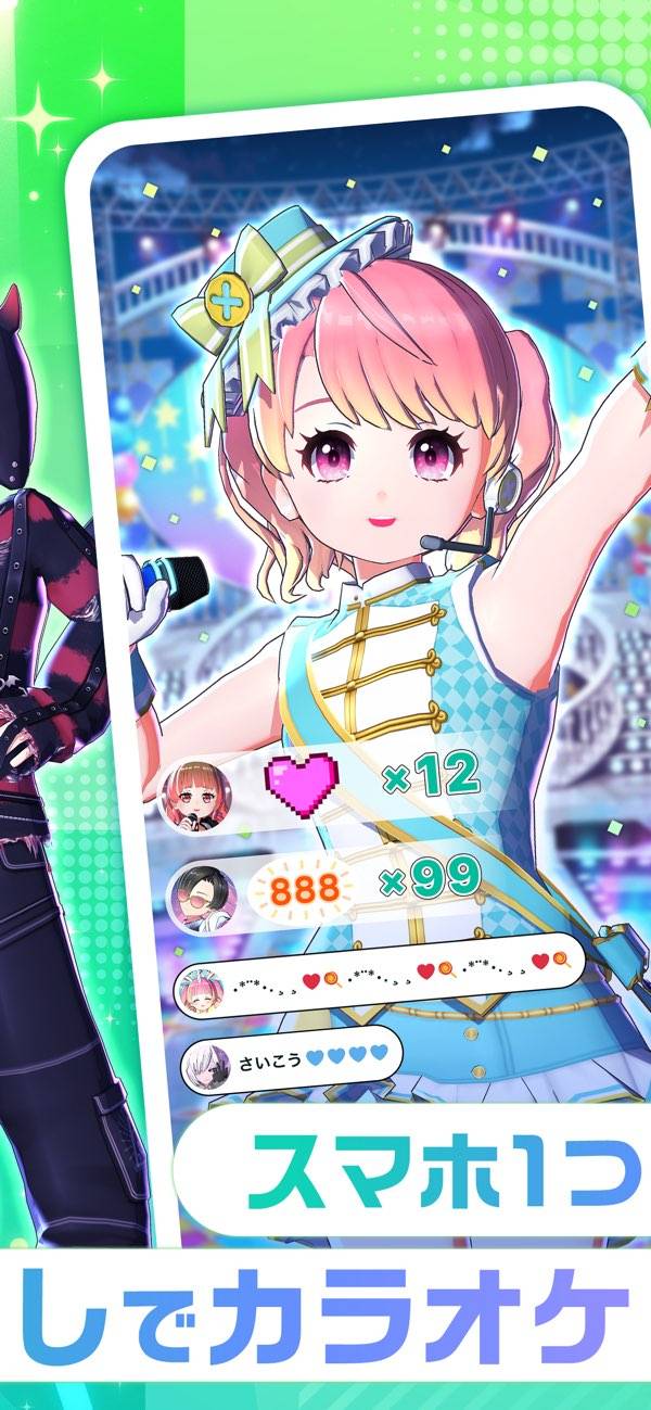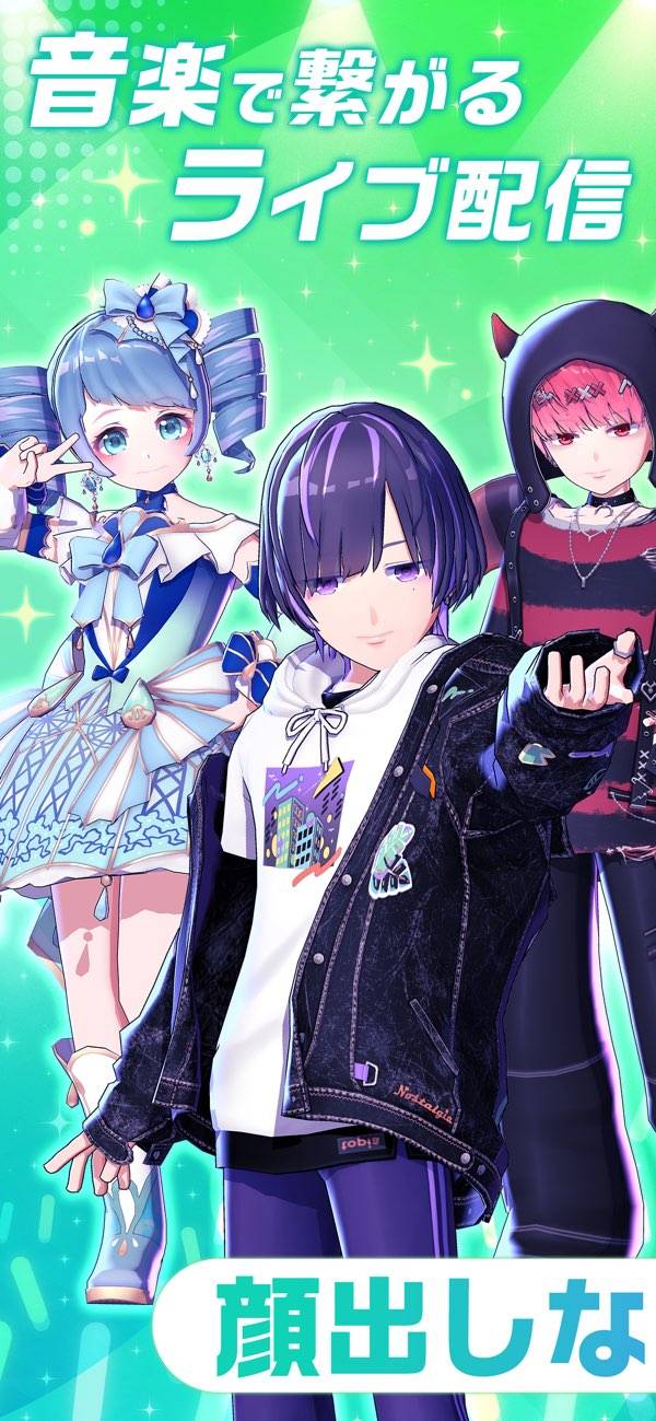 顔を出さずに本格的な歌枠配信を楽しめるアプリ。ライセンス取得済みの2万曲以上の音源から好きな楽曲で歌ってみた配信が可能。顔出しの不安がある人も自分だけのアバターを作成して配信できるため、プライバシーを守れます。さらに最大12人でのコラボ配信にも対応しており、みんなで配信を盛り上げられます。