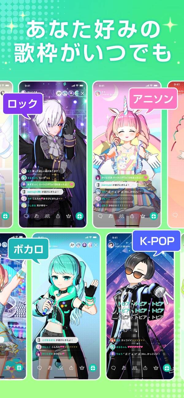楽しいです!アバターもかわいいです♡でもわたしは他の配信者さんのルームに入ることが多いです!歌を聞くだけじゃなく雑談とかできます⸜(๑’ᵕ’๑)⸝古い曲歌ってる人も結構いて、お母さんもハマっておばあちゃんにも勧めてました笑 家族で楽しんでます(⋈◍>◡<◍)。✧♡