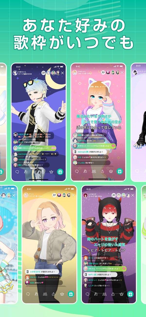 顔を出さずに本格的な歌枠配信を楽しめるアプリ。ライセンス取得済みの2万曲以上の音源から好きな楽曲で歌ってみた配信が可能。顔出しの不安がある人も自分だけのアバターを作成して配信できるため、プライバシーを守れます。さらに最大12人でのコラボ配信にも対応しており、みんなで配信を盛り上げられます。