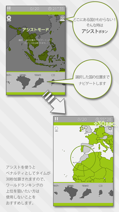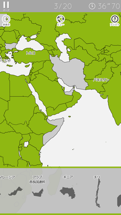 遊びながら世界の国が覚えられるパズルゲームです。クイック、エリア、興味の分野ごとに遊べるセレクション等、自分に合ったモードで出来ます。分からなくてもアシスト機能もあるので、なかなか良いと思いました。かなり細かい国も出ていて為になり、ホントに遊びながら学べます‼︎