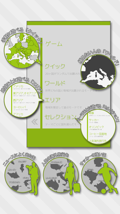 国の出題範囲はモードによって違い、好きなものを選べます。地域だけでなく、サッカー強豪国や人気の旅行先といったテーマから選ぶモードも。より世界の国々への興味を持てるかもしれません。