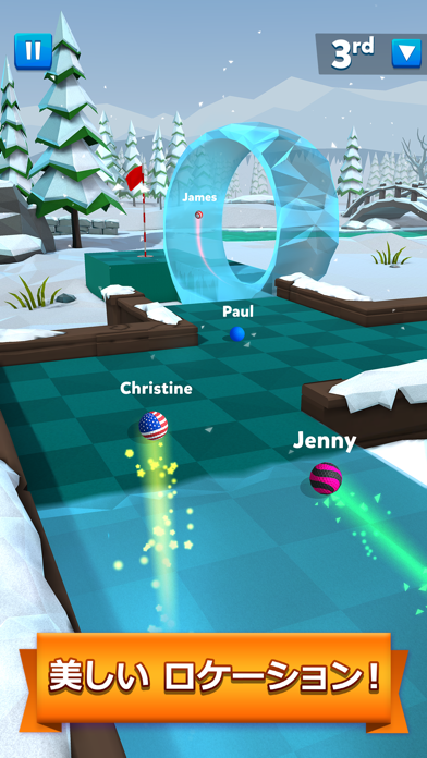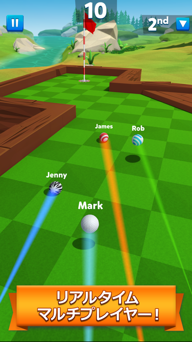 世界中のプレイヤーとパターゴルフで競い合うカジュアルゲームです。障害物があったり、ジャンプ台があったりとゲームならではの楽しい仕掛けが盛りだくさん。複数のコースを周り、最終スコアで勝敗が決まるため最後まで気が抜けません。