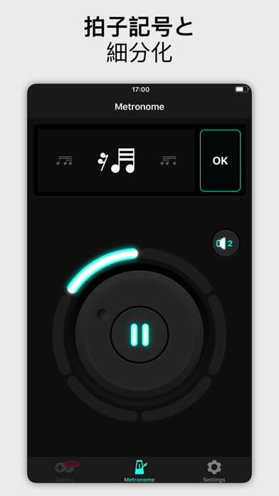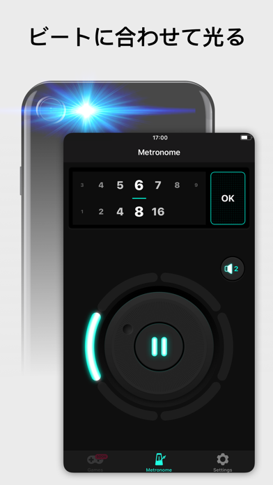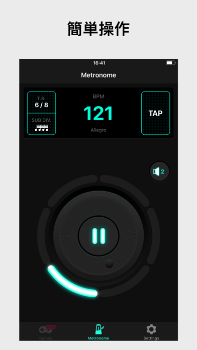 ネオン風のスタイリッシュなデザインのメトロノームアプリです。BPMやT.S.の変更が直感的にでき、使いやすいのが魅力。またリズムゲームなどちょっとした機能が搭載されており、100BPMがどれくらいのテンポか体験できます。