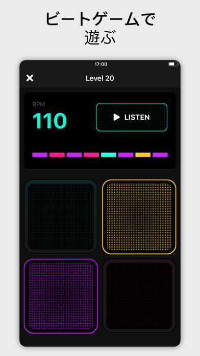 ○○BPMがどれくらいのテンポか学べる、ミニゲームを搭載。お手本のリズムを聞いて覚えた後、お手本と同じようにボタンをタップしていくとクリアです。無料版では4~5ステージほどしか遊べませんが、有料版の購入ですべてのステージをアンロックできます。