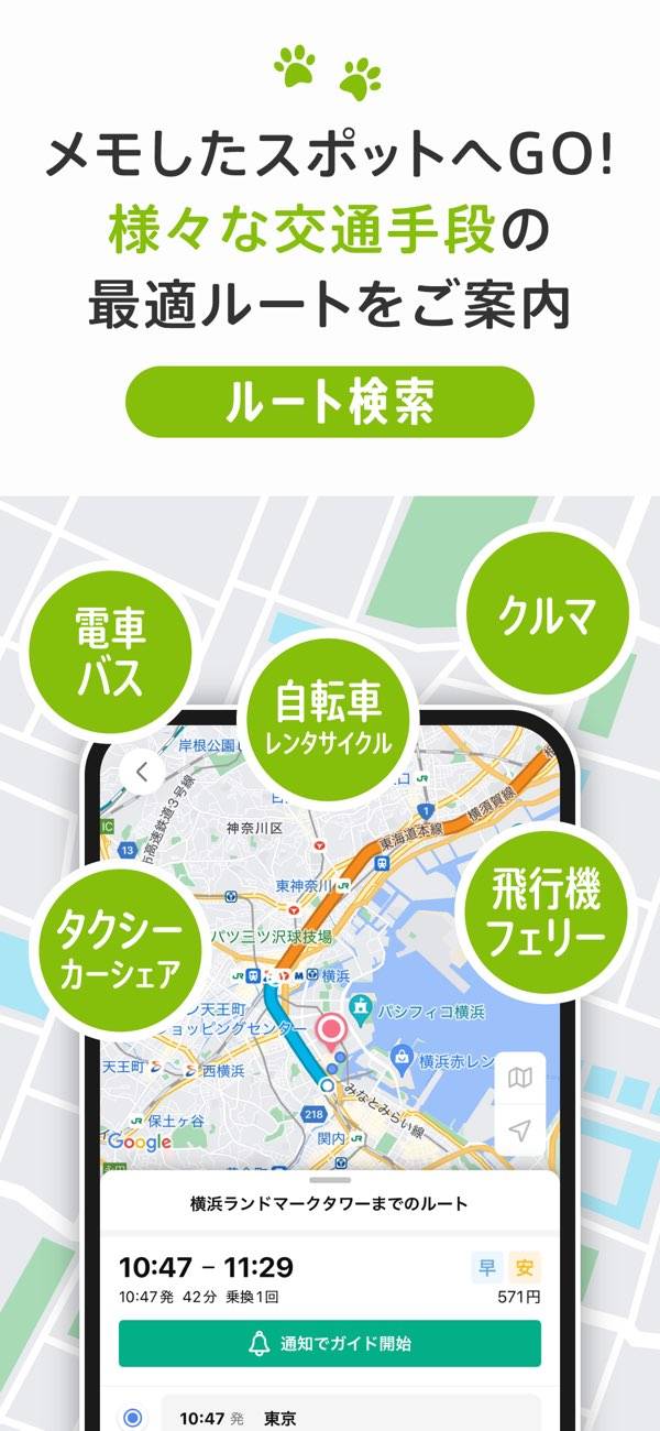 - 徒歩・電車・バスなど、移動手段を組み合わせたルート検索に対応