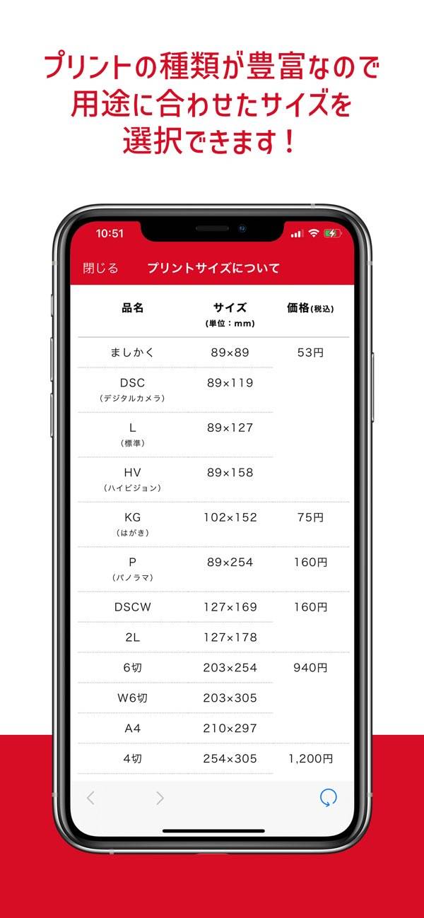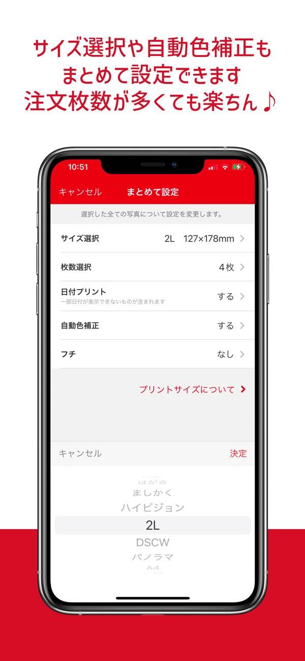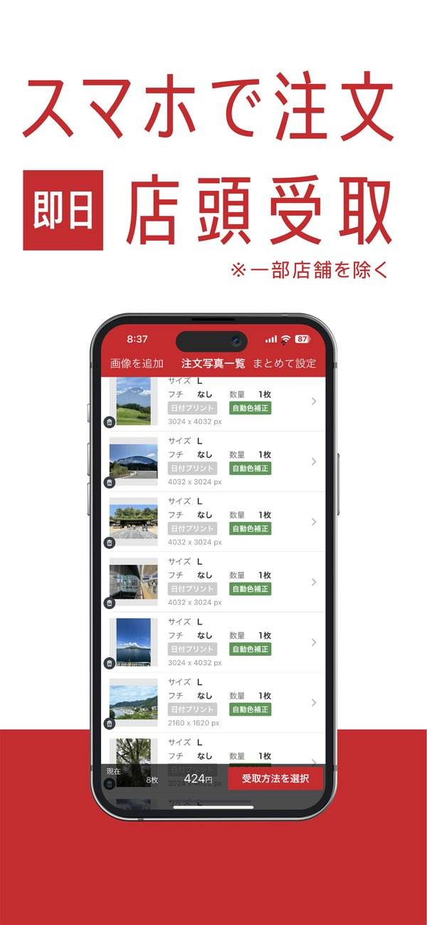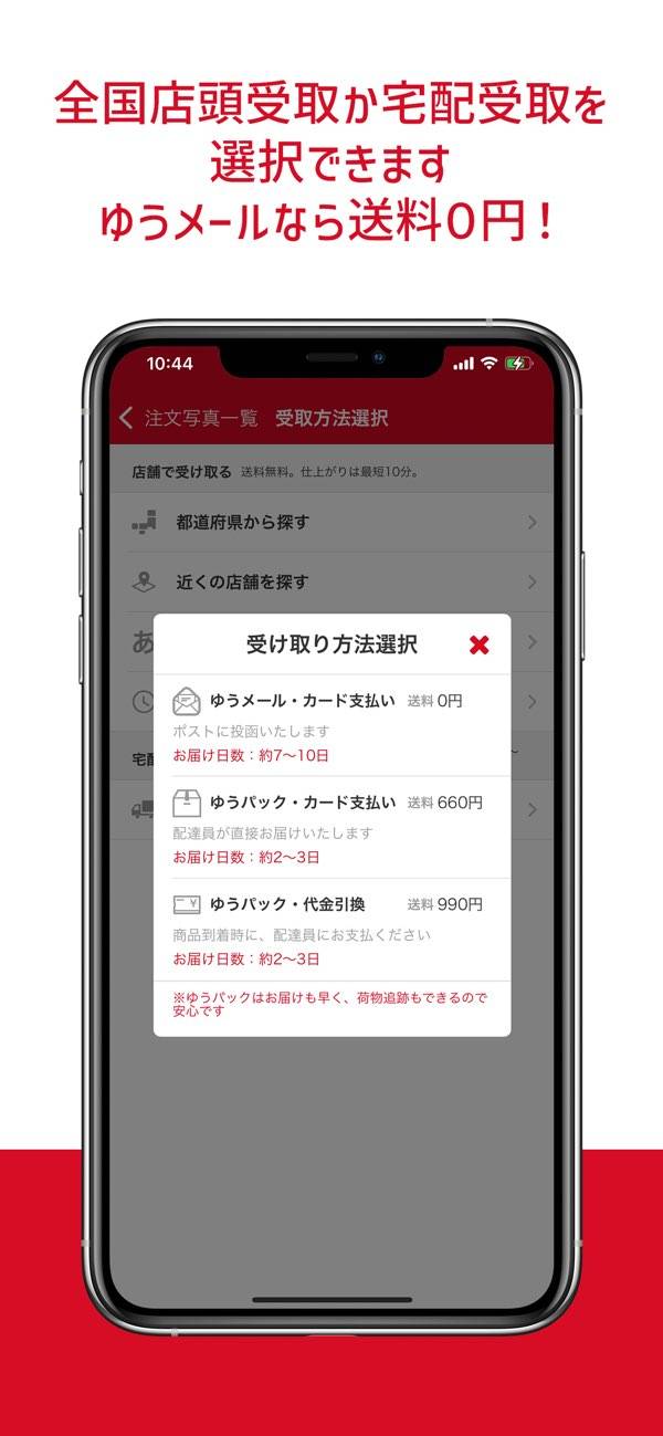 注文はアプリで数タップするだけ。たくさんの写真をまとめて選んで、店頭受け取りや配送が選べます。