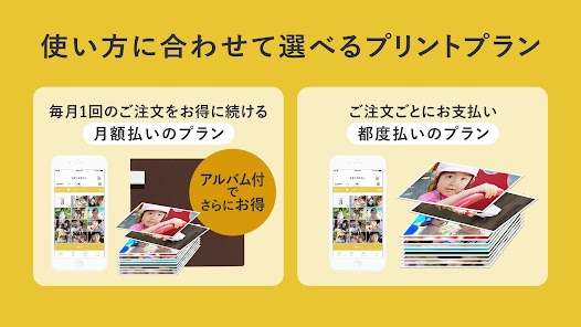 利用者のニーズに応じた3つのプランが用意されています。お得な月額払いプランやアルバムセットがついてくるプランなど、自分に合った方法を選べます。始めたいときにすぐに注文でき、また予算や使い勝手に合わせて続けやすいのが魅力です。