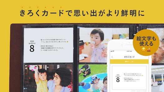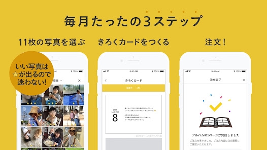 たった10分で家族の大切な記録をアルバムに残せる機能が便利なアプリ。写真を11枚選び、成長の記録をカードに記入するだけ。アプリによる注文のリマインドで、注文忘れの心配がありません。手軽に始められるので、家族写真の整理にも重宝するでしょう。