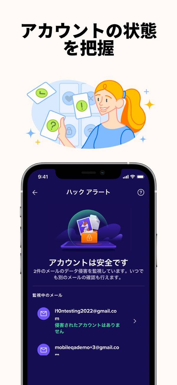 ショッピングサイトなどのログイン時に利用するパスワードが漏洩していないかをチェックできます。メールアドレスに関連付けられたパスワードが、ネットワーク上に流出した場合は通知でお知らせ。万が一ダークウェブに流出している場合はアラートで通知してくれるため、素早く対処できるようになっています。