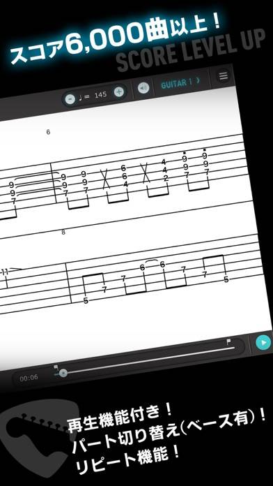 TAB譜形式でフレーズを確認しながら練習できます。再生するパートやテンポは自由に設定できて、気になる部分はループで繰り返しチェック。