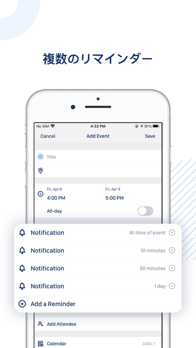 リマインダーは通常のアラートだけでなく、メールでも送信できます。GmailなどPCでも使えるアドレスに送信しておけば、PCを操作しているときでもすぐ気づけるでしょう。リマインドの時間も細かく設定できるため、余裕を持って予定に臨めます。
