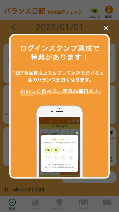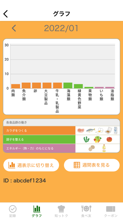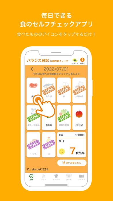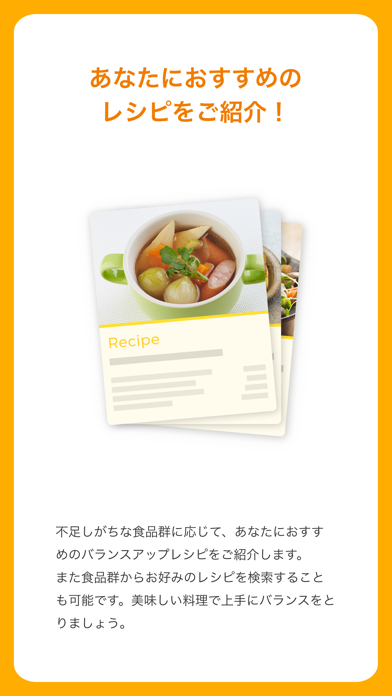 その日に食べた食品群を記録できるアプリです。食べた食品を記録しておくことで、バランスの良い食事ができているかをチェックできます。