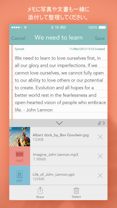 - 画像や手書きメモも添付できるため、メモの表現の幅が広い