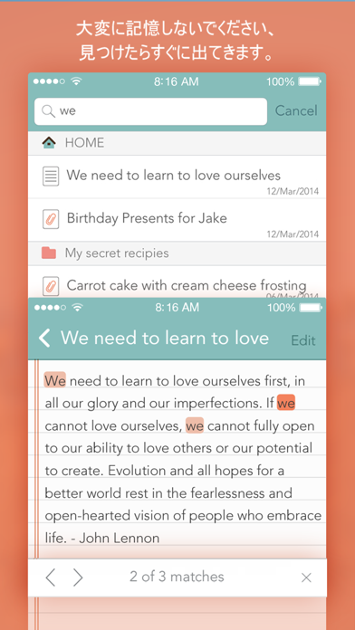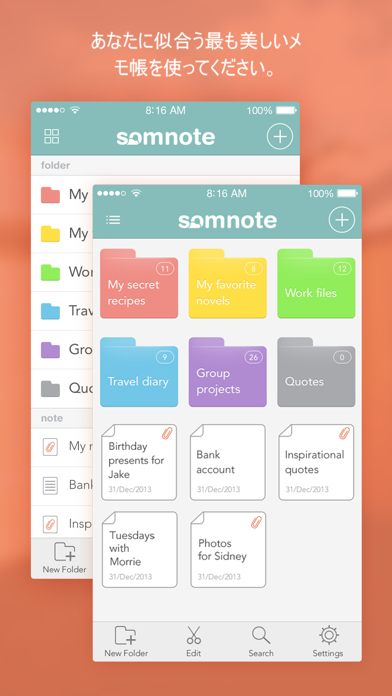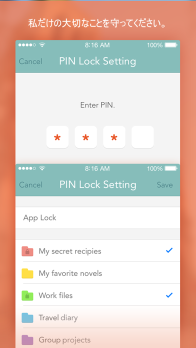 このアプリにはフォルダ機能が備わっています。自由にフォルダを作り、色とタイトルを決め、メモを効率よく管理することが可能。また、パスワードを設定してアプリ全体にロックをかけたり、ロックする対象を特定のフォルダに絞ったりすることもできます。