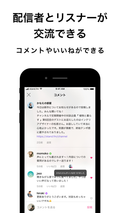 - 配信を聴きに行くのもOK、コメントやアイテムで交流を楽しもう
