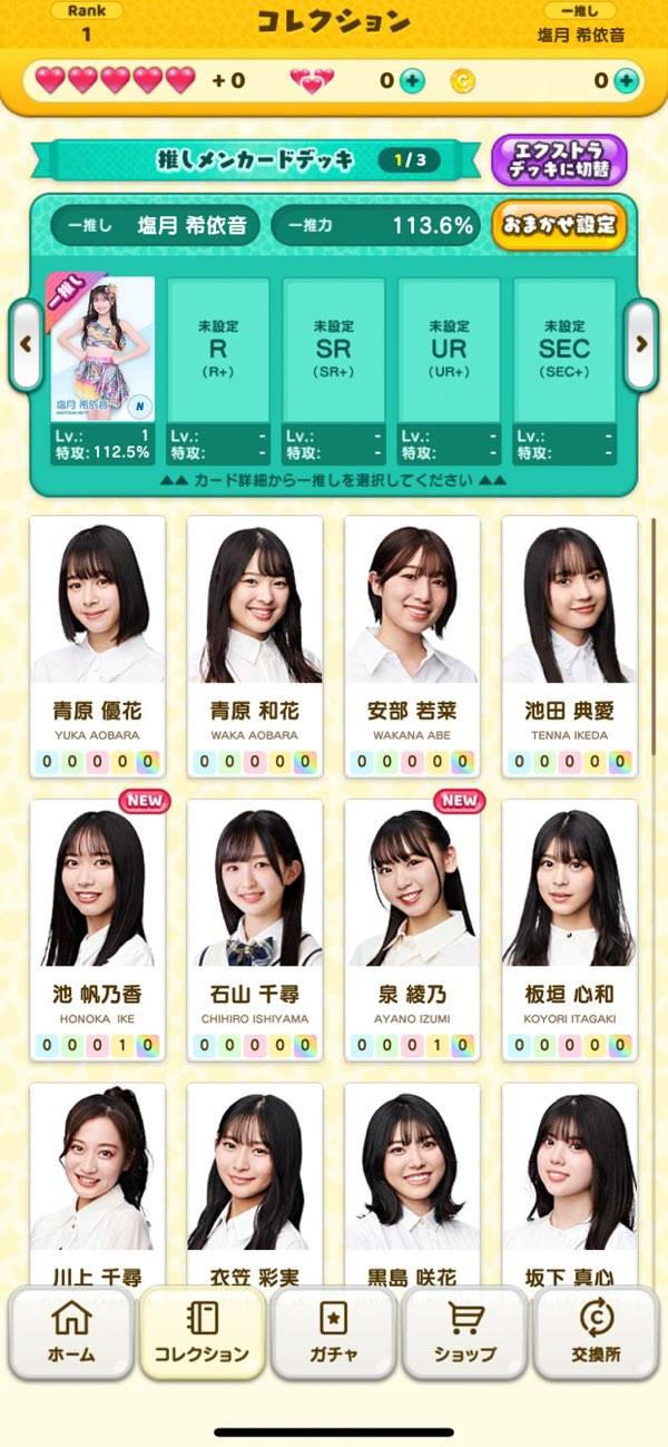 ▲ガチャで推しメンカードをコレクション。デッキに編成してプレイすると、レベルが上がりカードの絵柄も変化。