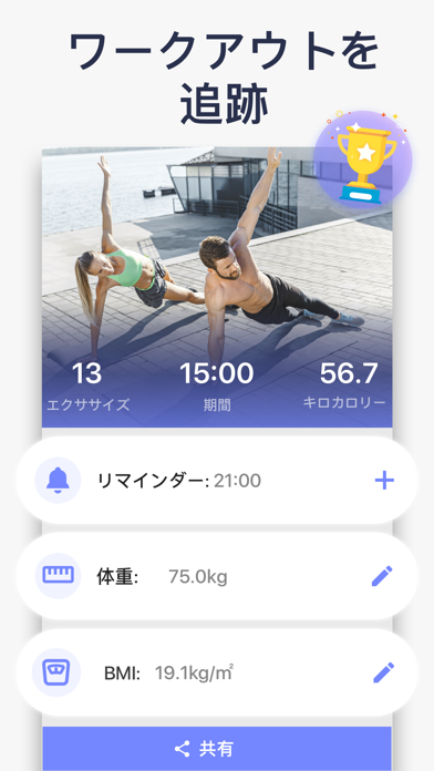 身体の芯である体幹を鍛えるためのトレーニングアプリです。プランクは同じ姿勢を維持するだけの簡単なトレーニングですが、30秒取り組むだけでも身体がプルプルします。自動生成してくれるプランを30日間こなし、引き締まったボディを目指しましょう。