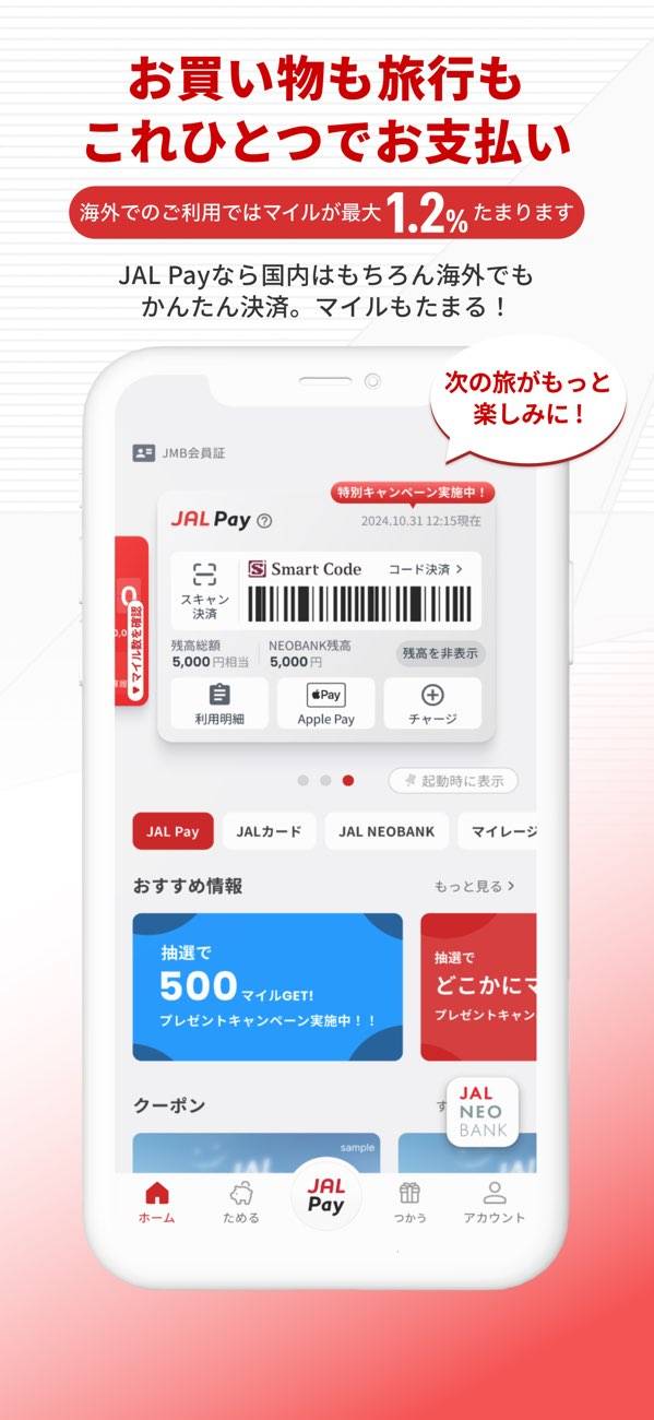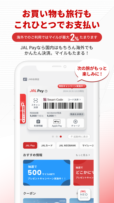 日常のお買い物でマイルが貯まるJAL Pay機能を搭載。マイルや銀行口座からのチャージに加え、クレジットカードからもチャージ可能です。Apple Payにも対応し、国内外でスピーディーな決済ができます。