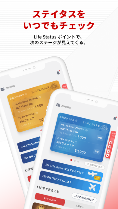 会員証がアプリ上で表示できます。Starグレードの確認や次のステイタスまでの必要ポイント数もひと目で確認可能。スマホ1つで会員証の提示やステイタス確認ができ、JALマイルの普段使いがより便利になります。