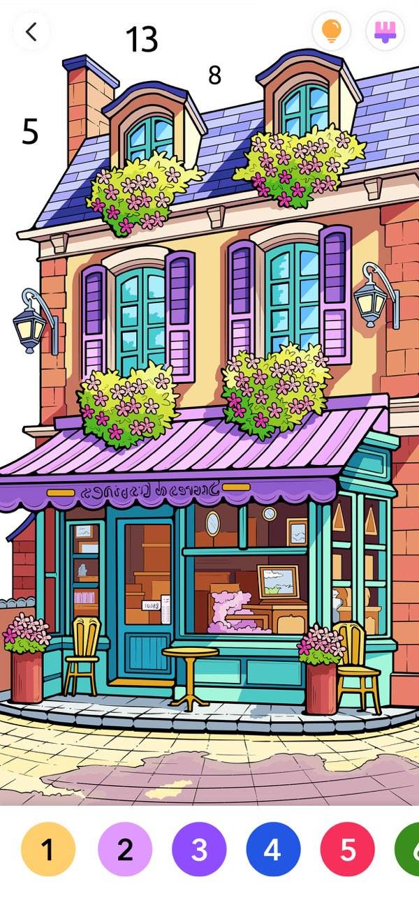下のパレットから色を選ぶと、画面にあるその色の箇所をタップで塗れます。お手軽な操作で塗り絵を完成させましょう。仕上がりはリアルな写真や水彩画のようなスタイルが多く、線画の強調された元の絵とは違和感が目立つのが惜しいところ。