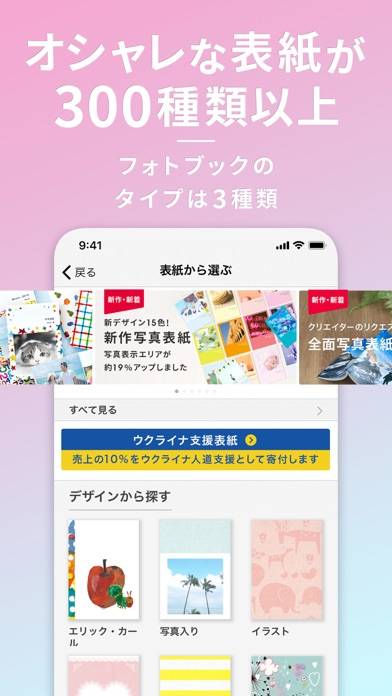 スマホに保存されている写真を使って、4種類のグッズを作れます。ラインナップは、フォトブック・卓上カレンダー・ポストカード・毎月カレンダーの4つ。フォトブックは、300種類以上の表紙から選べて、中には人気キャラクターとのコラボデザインもあります。