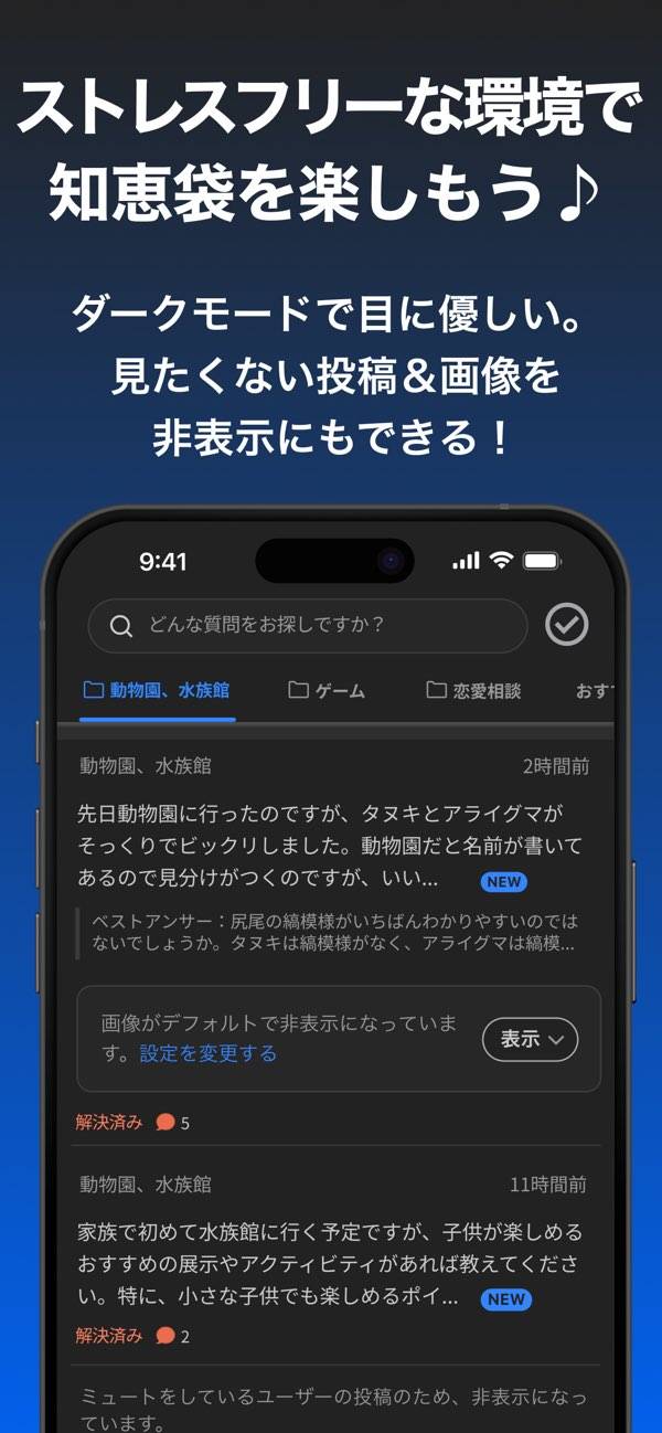 困ったときの強い味方「Yahoo!知恵袋」の公式アプリ。人に言いづらい悩みや不安、ちょっとした質問を匿名で相談できます。投稿すれば、同じような経験を持つ人や知識のある人から返信が届くことも。恋愛や人生のつまずきも、誰かの言葉で少し軽くできる、そんな場所になっています。