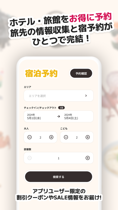 • ホテル予約やクーポンの配信もあり。宿探しから予約までアプリひとつで完結