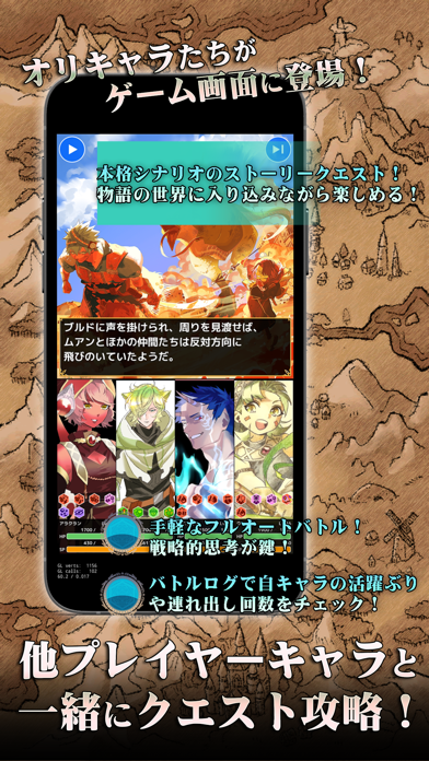 ▲バトルは自動。4人編成となっており、自分以外の3人は他ユーザーのキャラから選択。