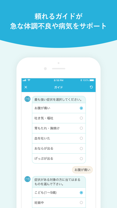本アプリは「ガイド」が付いており、タップするとメッセージアプリ風の画面が現れ、相談が可能。メッセージに従ってタップしていけば、すぐに受診すべきか手早く診断できるんです。ちょっとでも気になった症状があれば、ぜひ「ガイド」に聞いてみてください。
