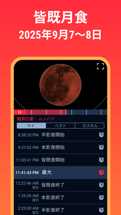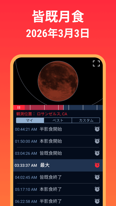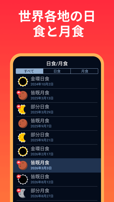 テレビや新聞のニュースで日食・月食が取り上げられていた時、「見よう」と思っても仕事や用事でベストなタイミングを逃すことってありますよね。今度こそ直接ちゃんと見たい、という人におすすめ。ニュースより早く予測してくれる本アプリを活用してください。