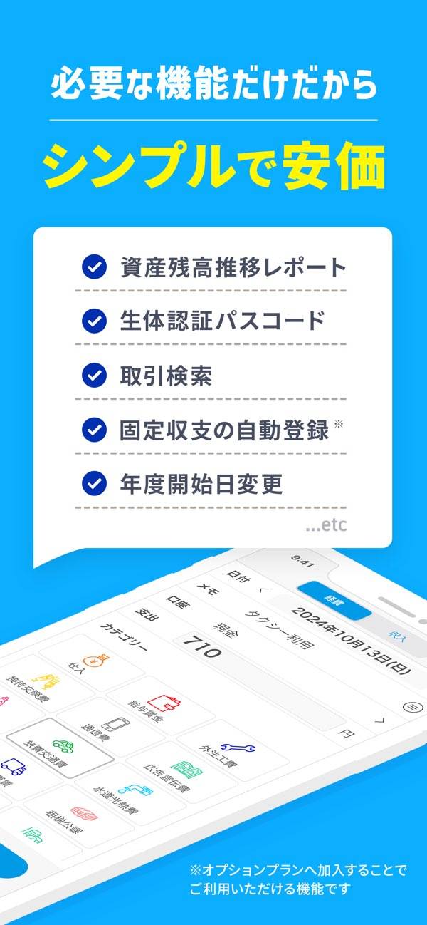 仕訳登録のスムーズな操作性が特徴の会計アプリ。金額とカテゴリを選ぶだけで手軽に仕訳を登録できるので、連続で入力する場合でも快適です。レポート機能もあり、収支の見直しや確定申告書の作成にも便利。