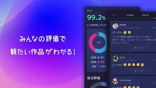 • 全体評価・観た後の気分・感想コメントによって、観た作品を評価できる