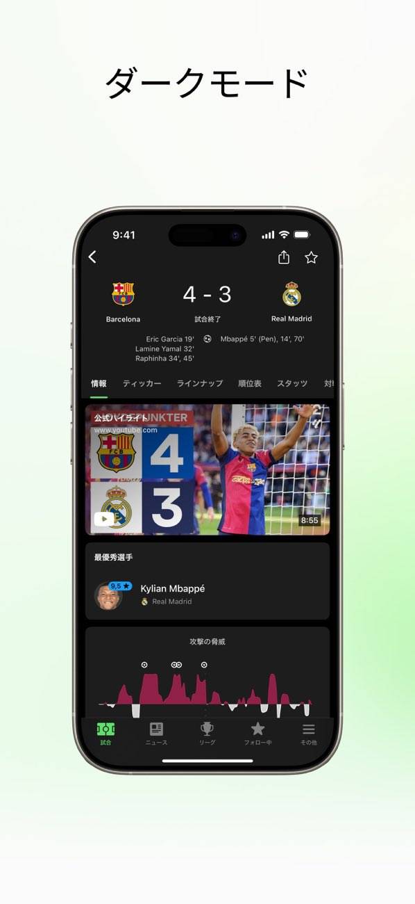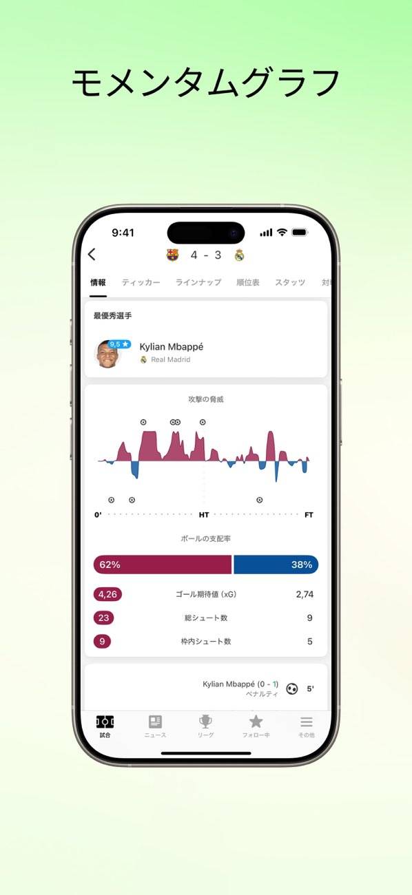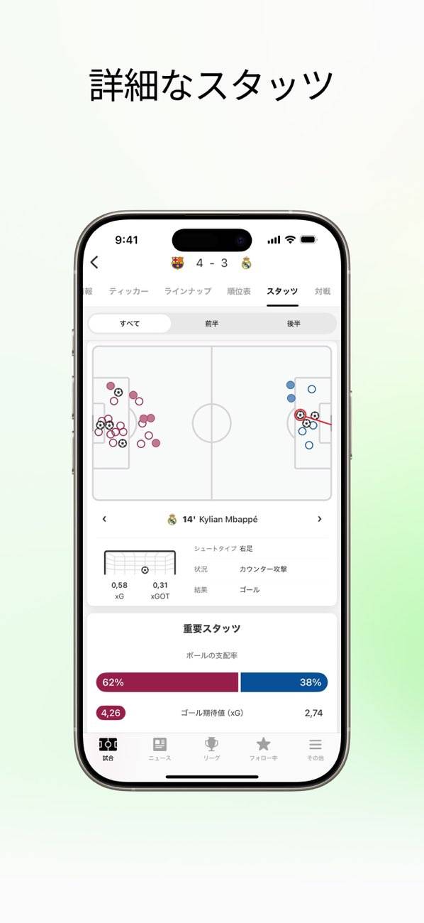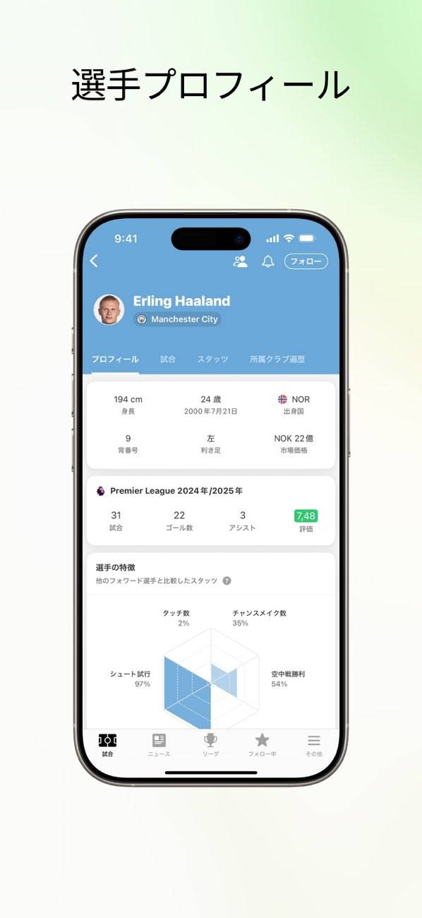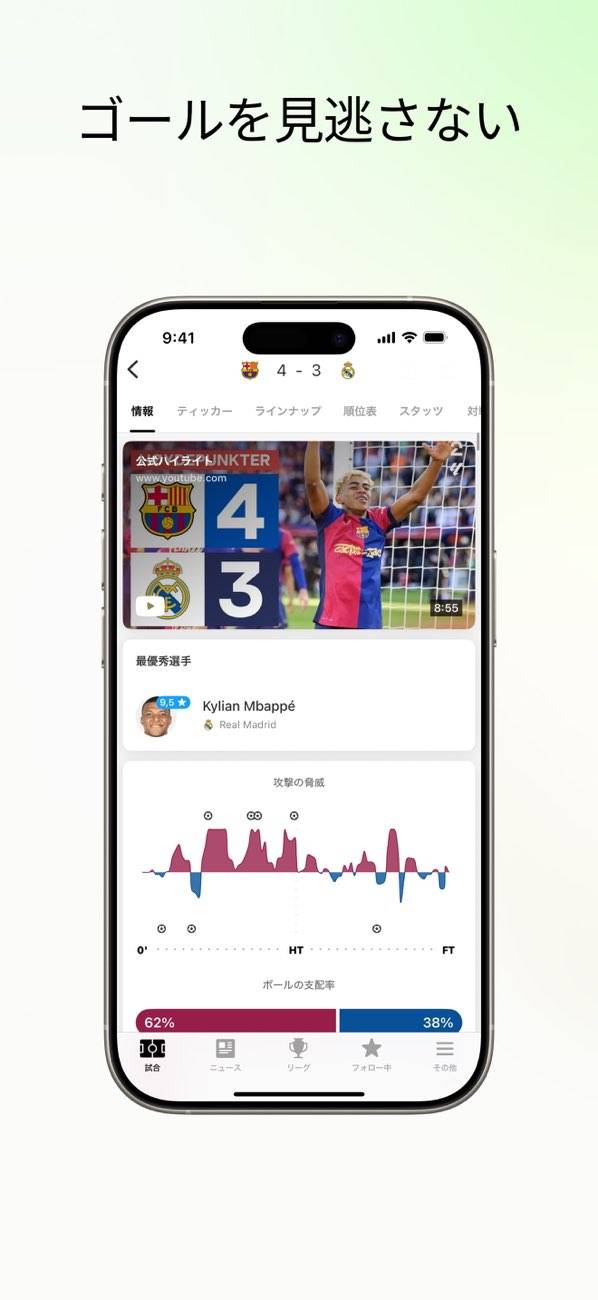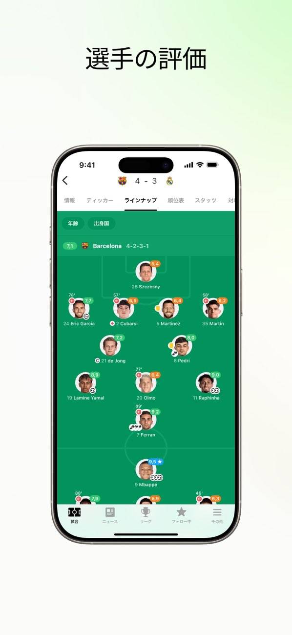 サッカーの試合スコアはもちろん、選手やスタッツの情報も公開されるアプリ。国内外のチームや好きな選手をフォローすると、試合の情報をGETできます。また国際試合の結果も配信されるので、サッカーワールドカップの試合情報もすべて公開されます。