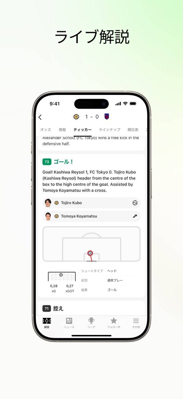 スターティングメンバーや選手の情報なども公開されます。試合後はポゼッション・シュート数といったスタッツや、選手の評価をチェックできるなど、試合後も楽しめるアプリとなっています。
