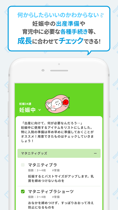 - 妊娠から子育て期までのタスク管理を家族と共有し、一元管理できる