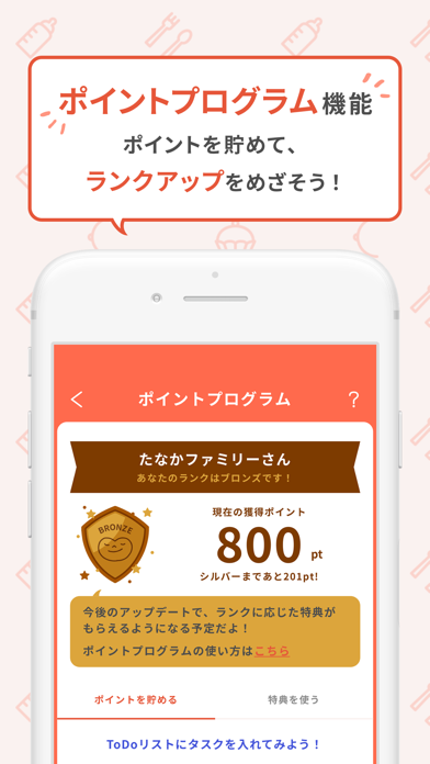 アプリ内の機能を使用するとポイントが貯まり、特典がもらえる機能も魅力的。さらに家族と共有できるToDoボードもあり、毎日のタスクを見える化できます。