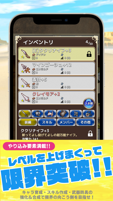 同じ武器でも「鉛」や「オリハルコン」といった素材が異なることで、性能が大きく変わります。素材を意識しながら、強い武器や防具を強化していきましょう。強い武器や防具をモンスターが落とすこともあるので、ダンジョンに潜り続けることが重要です。