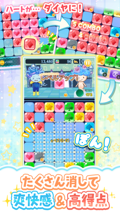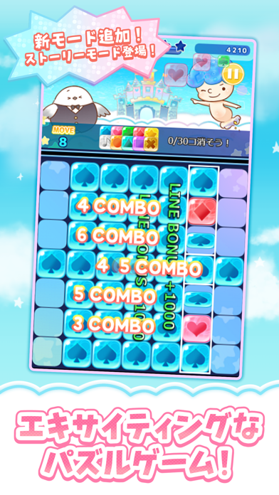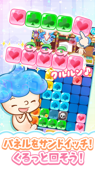 絵柄の描かれたパネルを置いて消していく、ちょっと変わったパズルゲーム。例えばハートのパネルが縦に並んでいたら、スペードのパネル2個で挟むとパネルがすべてスペードになって消せます。
