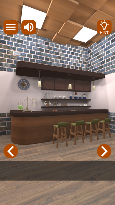 - カフェを探索する脱出ゲーム。レンガの壁と木製のカウンターがオシャレ