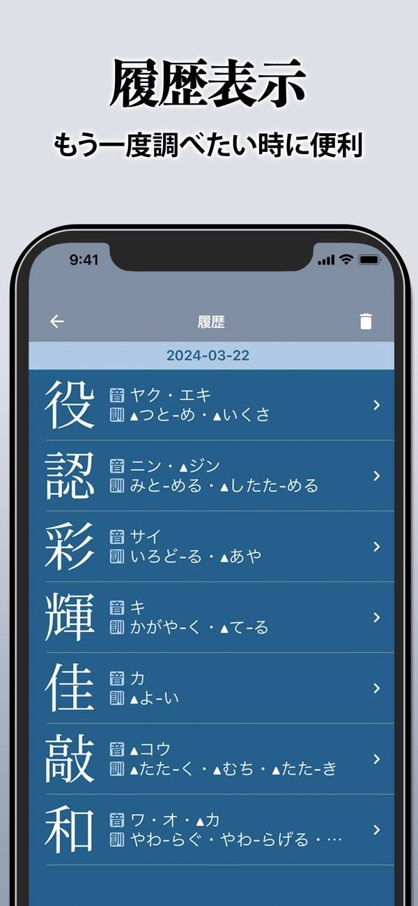 読めない漢字などを手書きで書くと、似た漢字を表示してくれます。漢字を一覧で検索でき、音読みと訓読みも同時にチェック可能。私は読み方がわからないときによく利用しますが、調べて読み方がわかったときはとてもスッキリします。当てはまる漢字をタップして、調べ物に役立ててください。