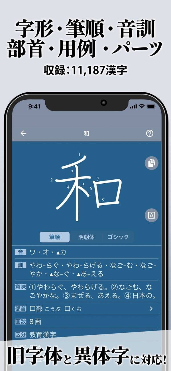 - 筆順・音訓・熟語も一覧表示。簡単&シンプルで幅広い年齢におすすめ