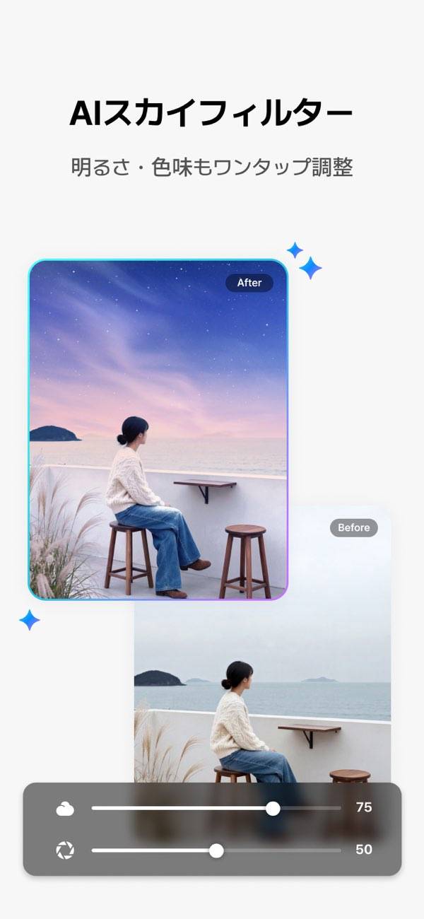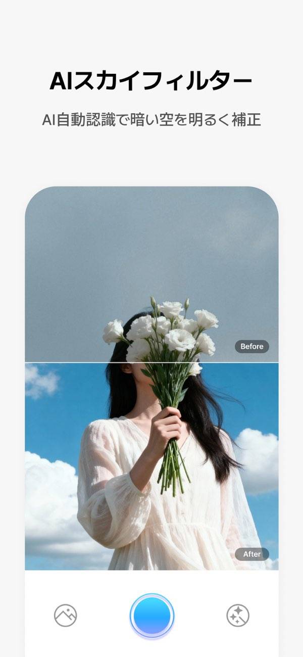 豊富なフィルターから好きな空模様を選んで加工できます。撮影した写真の空をアプリが自動で認識してくれるため、特別な設定は不要。またカメラモードでは、リアルタイムでフィルターを適用させられます。天候に左右されずきれいな写真が撮れますよ。