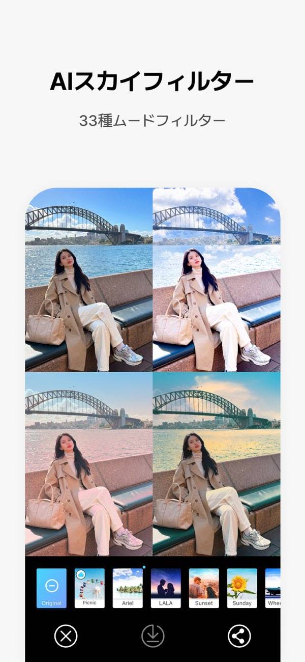 写真に写った空を自動認識し、空用のフィルターを適用させられるアプリです。雲ひとつない青空や、ファンタジックなピンク色の空などさまざまな雰囲気のフィルターがそろっています。