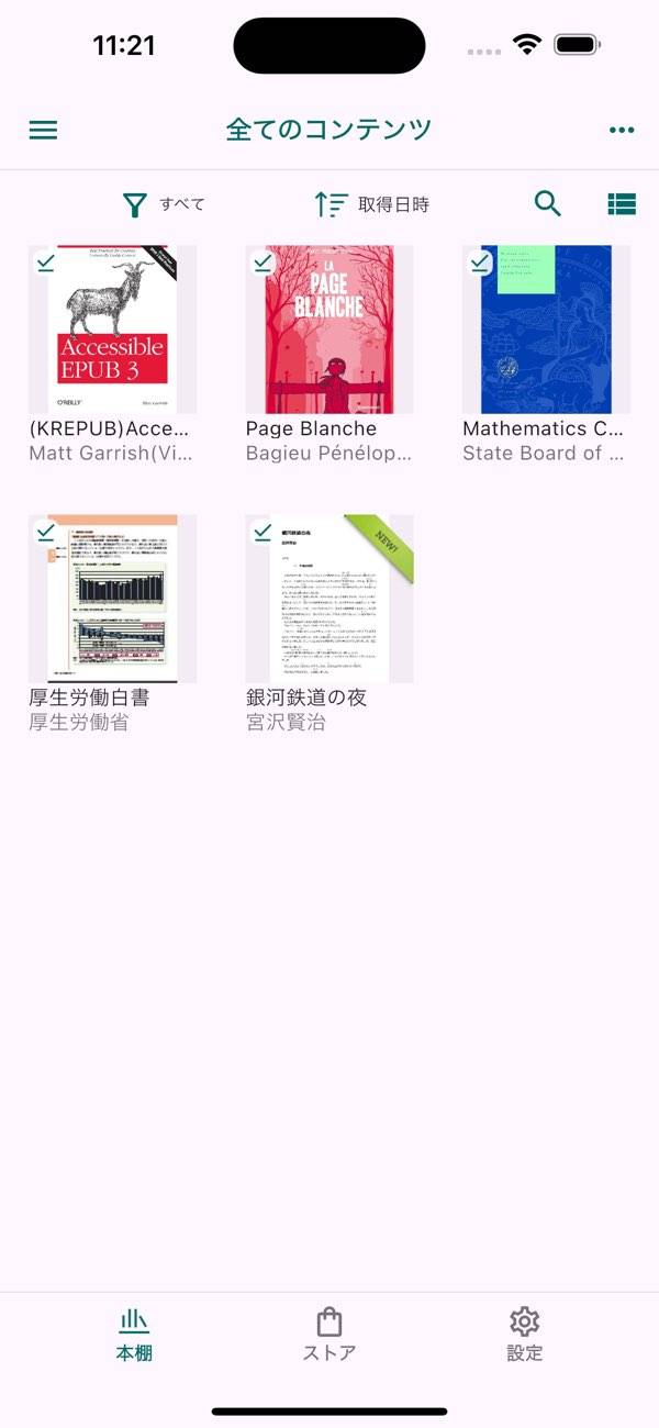 ダウンロードした電子書籍は本棚に一覧で表示されます。表示の切り替えができ、「表紙のみ」もしくは「表紙+作者+タイトル」の2種類から選択可能。また追加順された順・タイトル順・著者名順などに並び替えられることもできます。