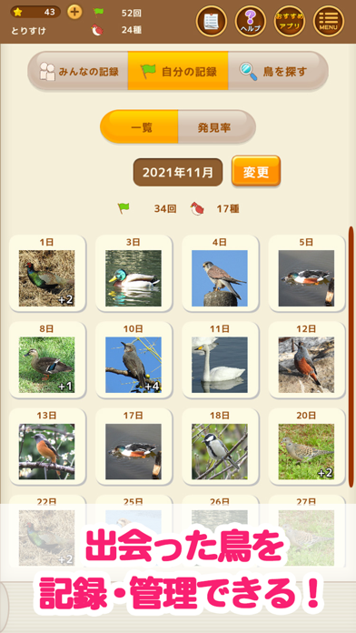 - 自分が見つけた鳥の場所や日時を簡単に記録できる