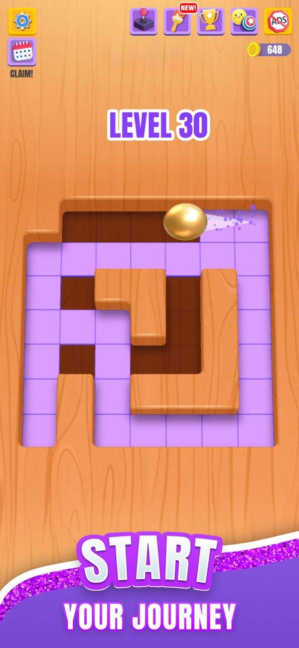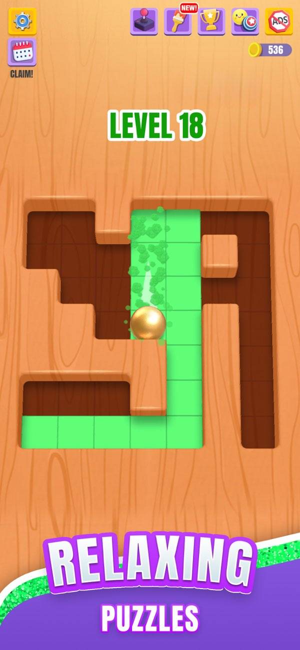 黒いマス状の道を染めていく、シンプルな塗りつぶしパズルゲーム。色のついたボールは一直線上にしか進めないので、どうやって全部のマス目に辿り着くかが重要です。気づけば同じ場所をぐるぐる回っているだけのときも……。頭を程よく使って楽しめますよ。